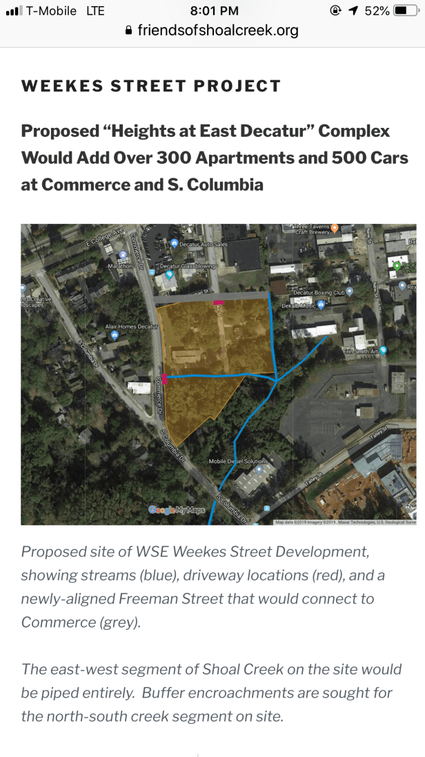 Friends of Shoal Creek believe this property presents an opportunity for the City to preserve existing green space and improve traffic safety in this part of Decatur. As mentioned earlier this flows into Shoal Creek at Dearborn Park and we do not know the effect this will have on our park.