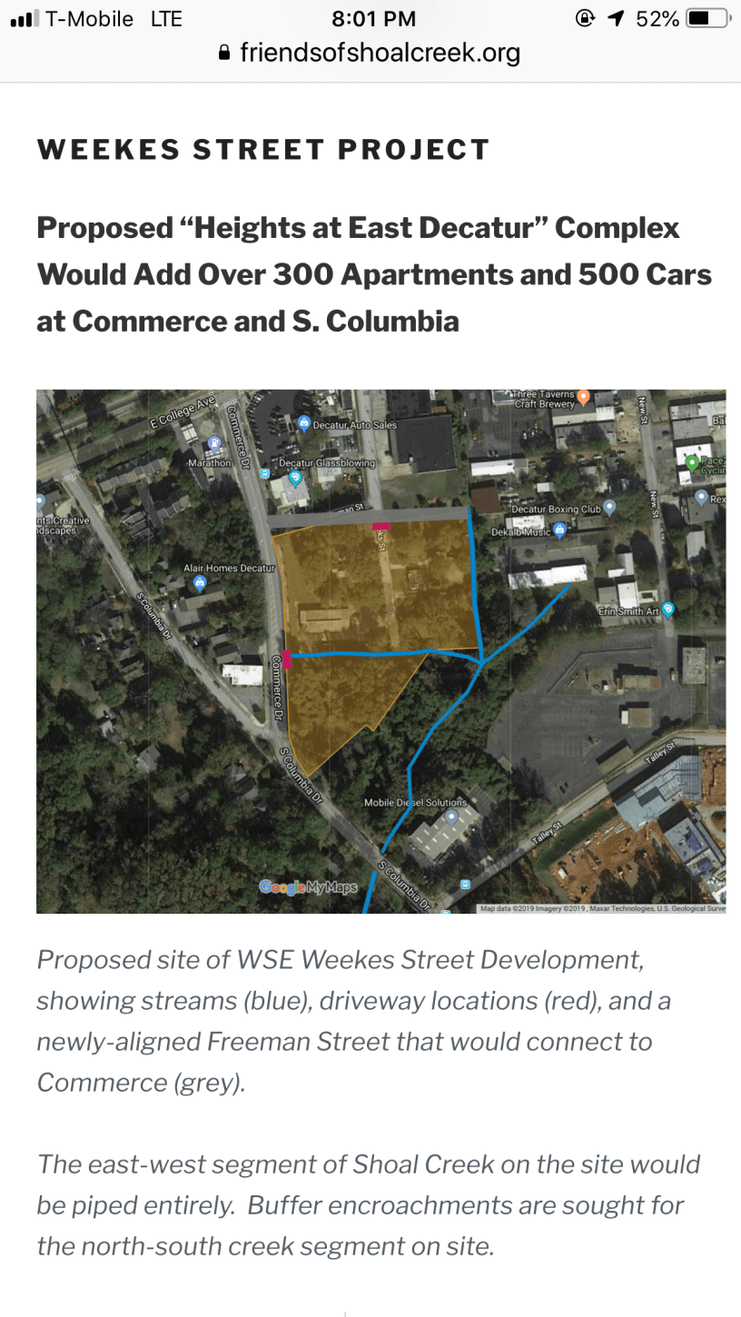 WSE Development is seeking a stream buffer variance for its Weekes Street project in City of Decatur near New Street to build over 300 apartments and 500 parking spaces on 4.2 acres fronting Commerce and S. Columbia Drives, also accessible via Weekes Street.