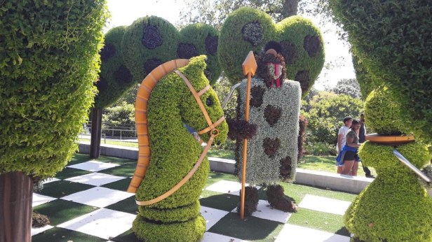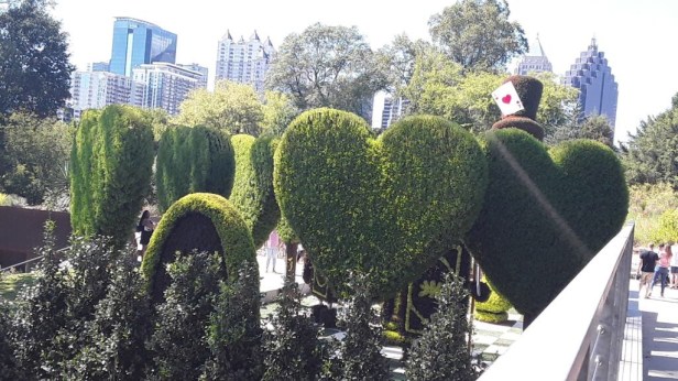 In Atlanta, a giant White Rabbit towers at more than 27 feet tall as it floats inside an upside-down umbrella in the Skyline Garden pond. That tops even the Garden’s resident Earth Goddess sculpture, at 22 feet. On the Skyline lawn is an expansive chess board bordered by nine heart “trees” each more than 12 feet tall, with a giant Cheshire Cat poised nearby. Alice herself is on hand – just elsewhere in the Garden.