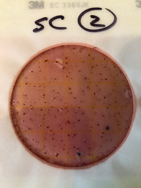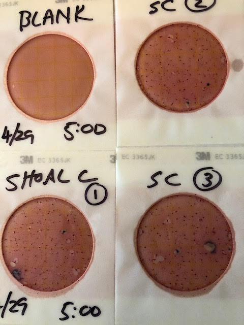 Look at the photos of the test results and you’ll see 6 purple colonies with a gas bubble. These are E. Coli colonies. The result is 200 colonies which is under the 235 or less recommended for full body contact. The water on that day was safe for the kids.