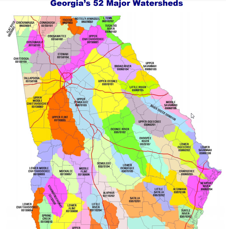 This geographic feature makes the headwaters of Shoal Creek especially notable, in that they are some of the uppermost headwaters for the entire watershed of the Ocmulgee River Basin, one of 14 of Georgia’s major river basins. The Ocmulgee River combines with the Oconee River downstream near Lumber City, Georgia, and from there flows to the Atlantic as the Altamaha River.
