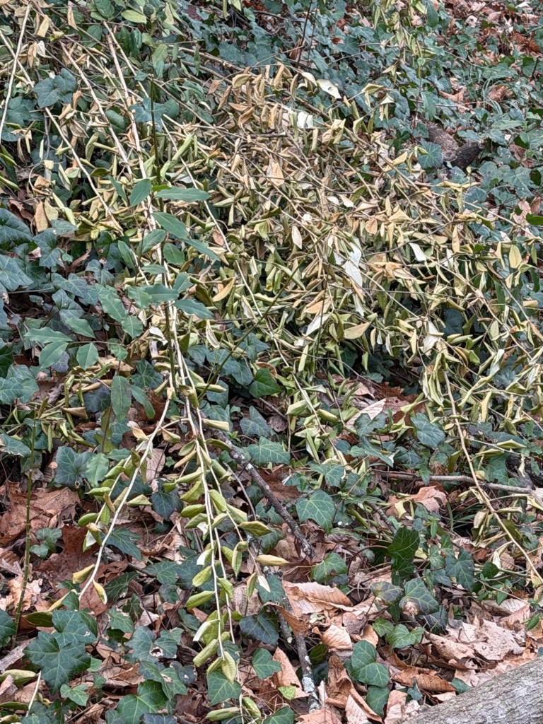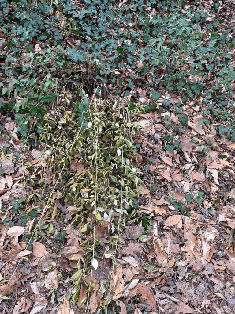 Many of the most aggressive invasive plants in our area don’t need roots, soil, or much encouragement at all to keep spreading. English ivy, privet, vinca, and similar species can re-root from cut vines, nodes, or even small fragments left in contact with the ground. When cut material is left on the forest floor, especially in shaded or moist areas, it often survives long enough to reestablish itself. In some cases, it spreads even farther than before.