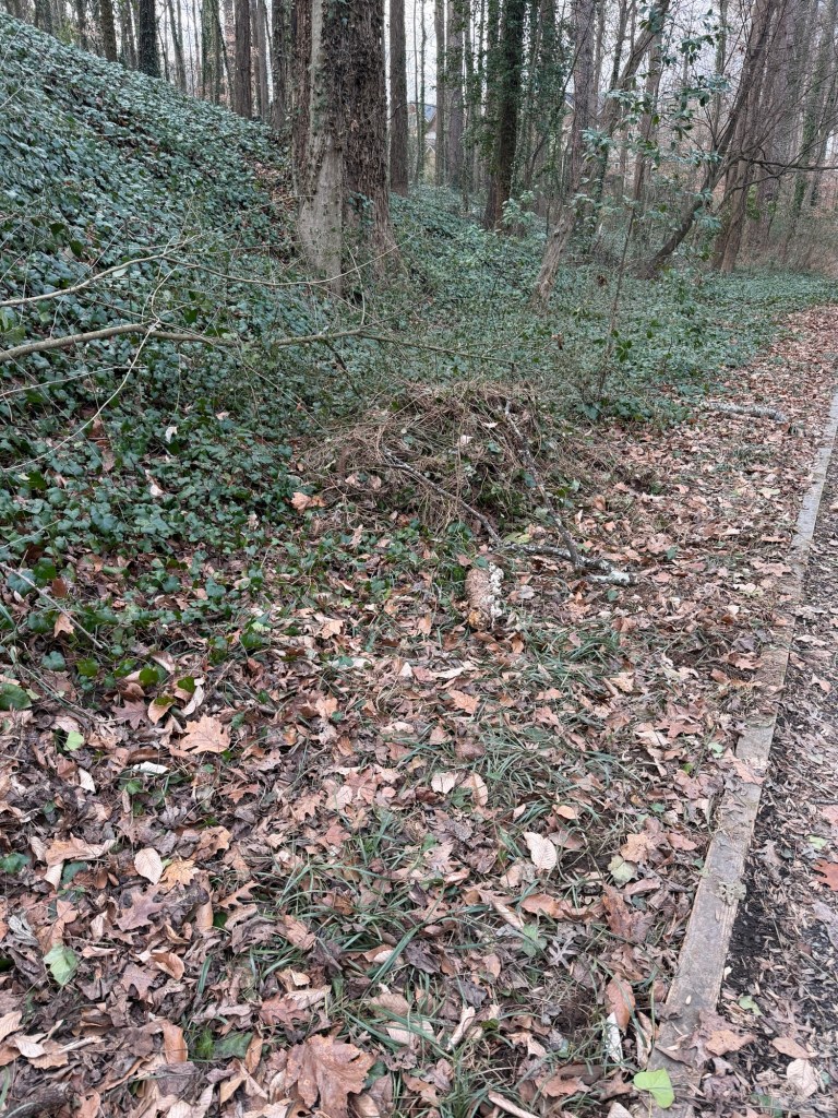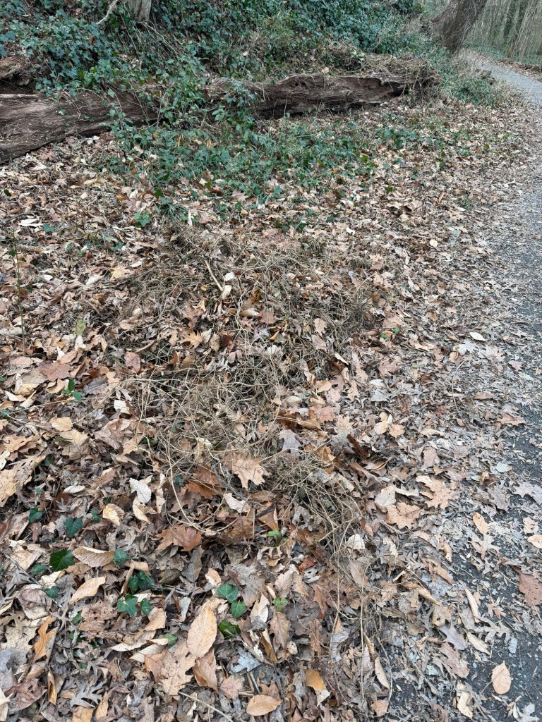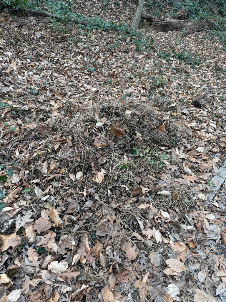 In several areas, invasive vines and shrubs have been cut back or pulled, which is great. That first step matters. But instead of being removed from the site, the cut material is often left right where it fell. Piled up. Sometimes neatly, sometimes not. Always still very much present.